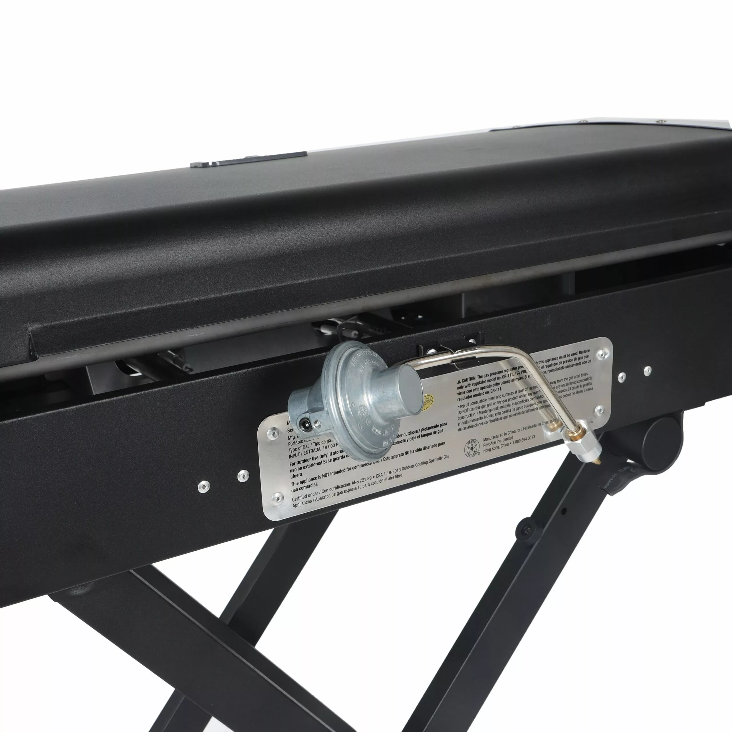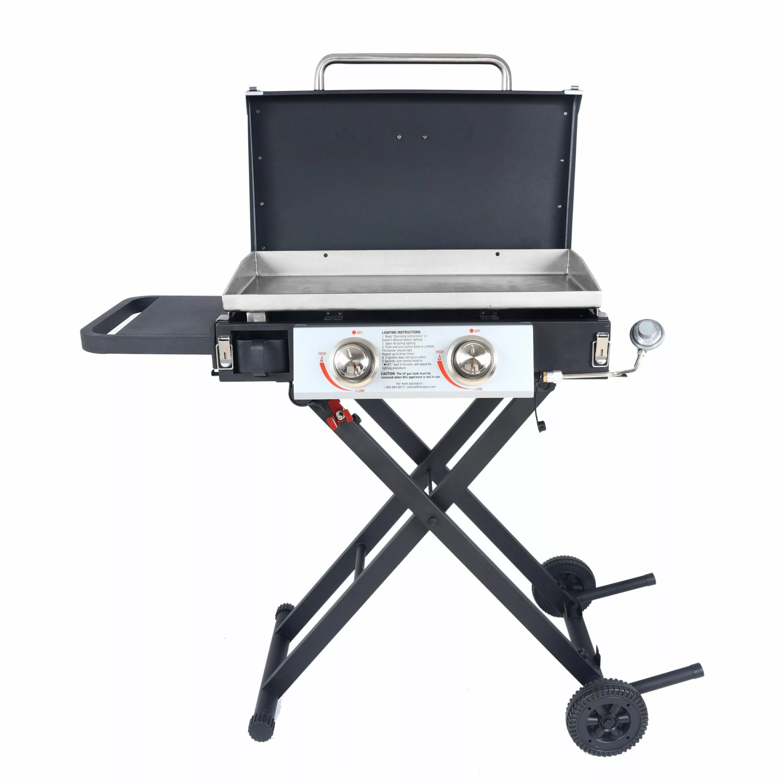 The Blue Rhino® 2 burner portable Razor™ griddle grill has plenty of room to cook all your favorite foods; perfect for backyard barbecues, camping and tailgating. With the integrated front access drain and cup, cooking and clean-up is a snap. The versatile cooking surface is great for breakfast, lunch and dinner while the unique mobile cart design makes it easy to folds for storage or transportation. With a side shelf and attached lid you can prep and cook.