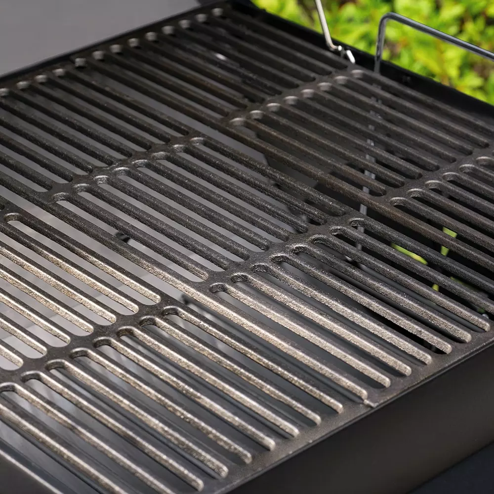 - Cast-iron cooking grates feature 638-sq in of total cooking area: 435-sq in primary and 203-sq in warming rack