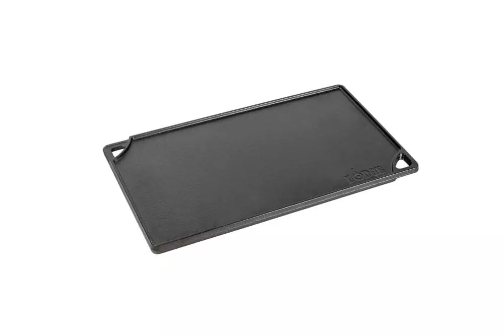 The Lodge Cast Iron Reversible Grill/Griddle features a smooth side for making grilled cheese sandwiches as well as eggs and pancakes. The ribbed side is perfect for grilling foods such as steak, fish, chicken and hamburgers. Seasoned with oil for a natural, easy-release finish that improves with use. At home in the oven, on the stove, on the grill or over the campfire, the grill/griddle is the right tool to sear, bake, broil, fry or grill. Cast iron is unparalleled in heat retention and even heating. Fits over two stovetop burners. Easy care hand wash, dry, rub with cooking oil.