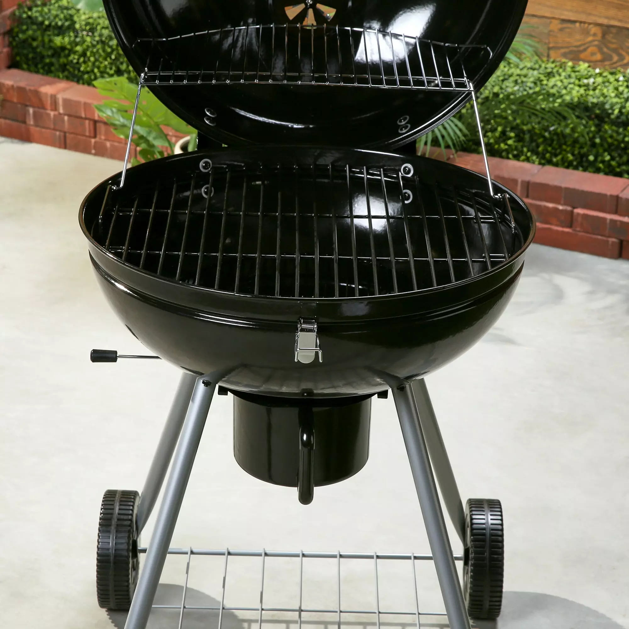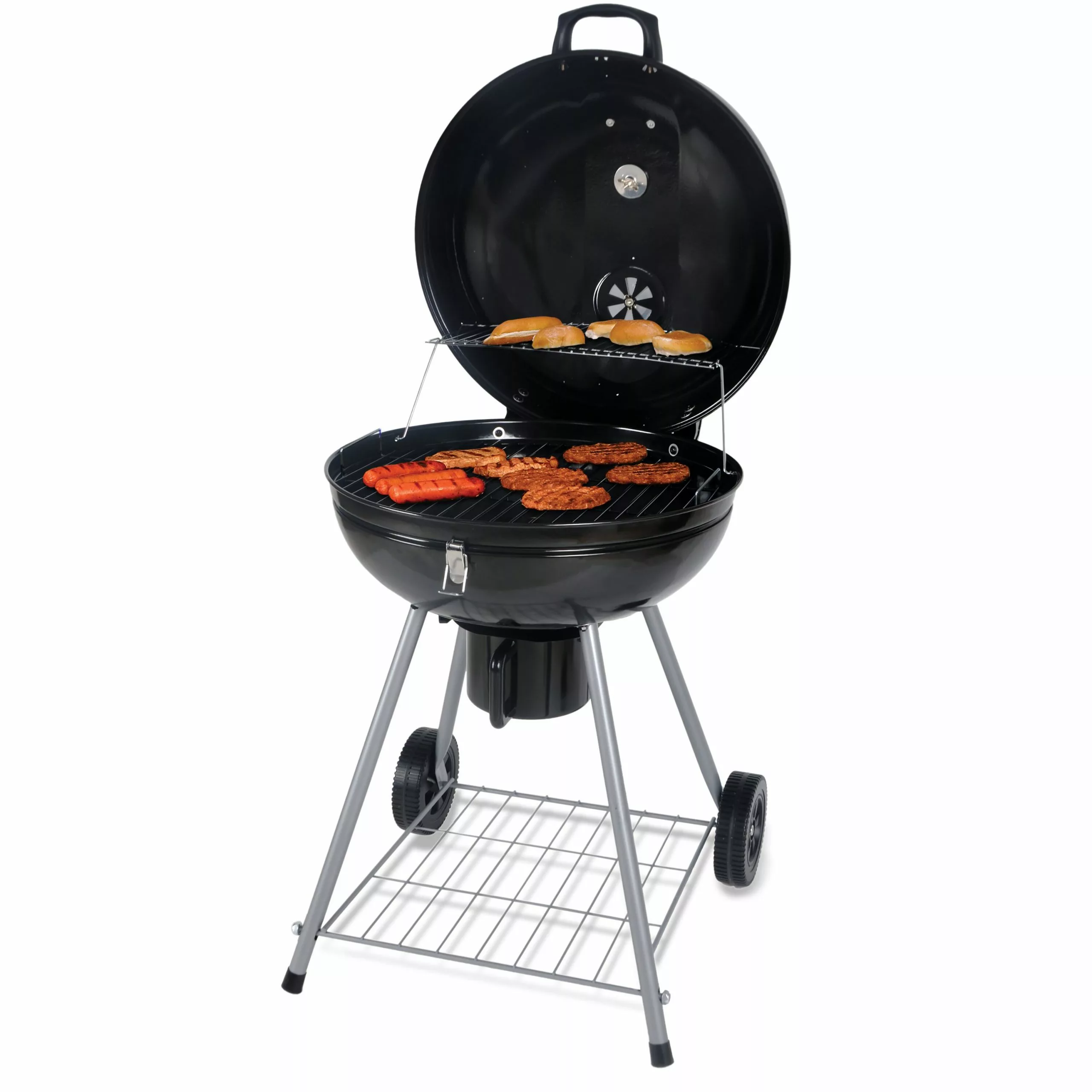 The Mr. Bar-B-Q 22-in charcoal grill has a total of 540-sq in cooking area, cook up to 27 burgers at a time. Built in temperature gauge and adjustable air vents for temperature control. Bottom storage shelf offer extra space. The wheels make transporting easy for your next event.