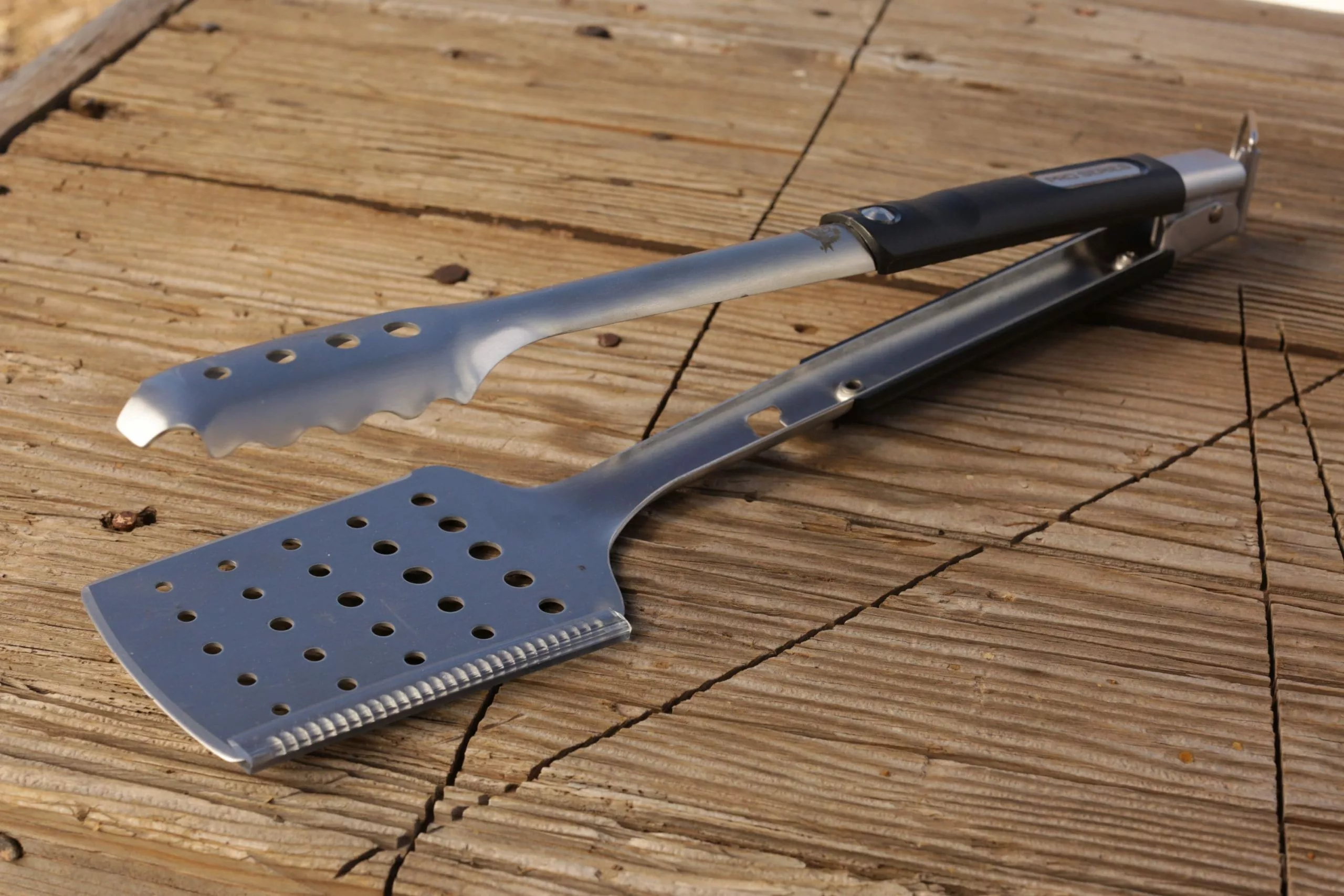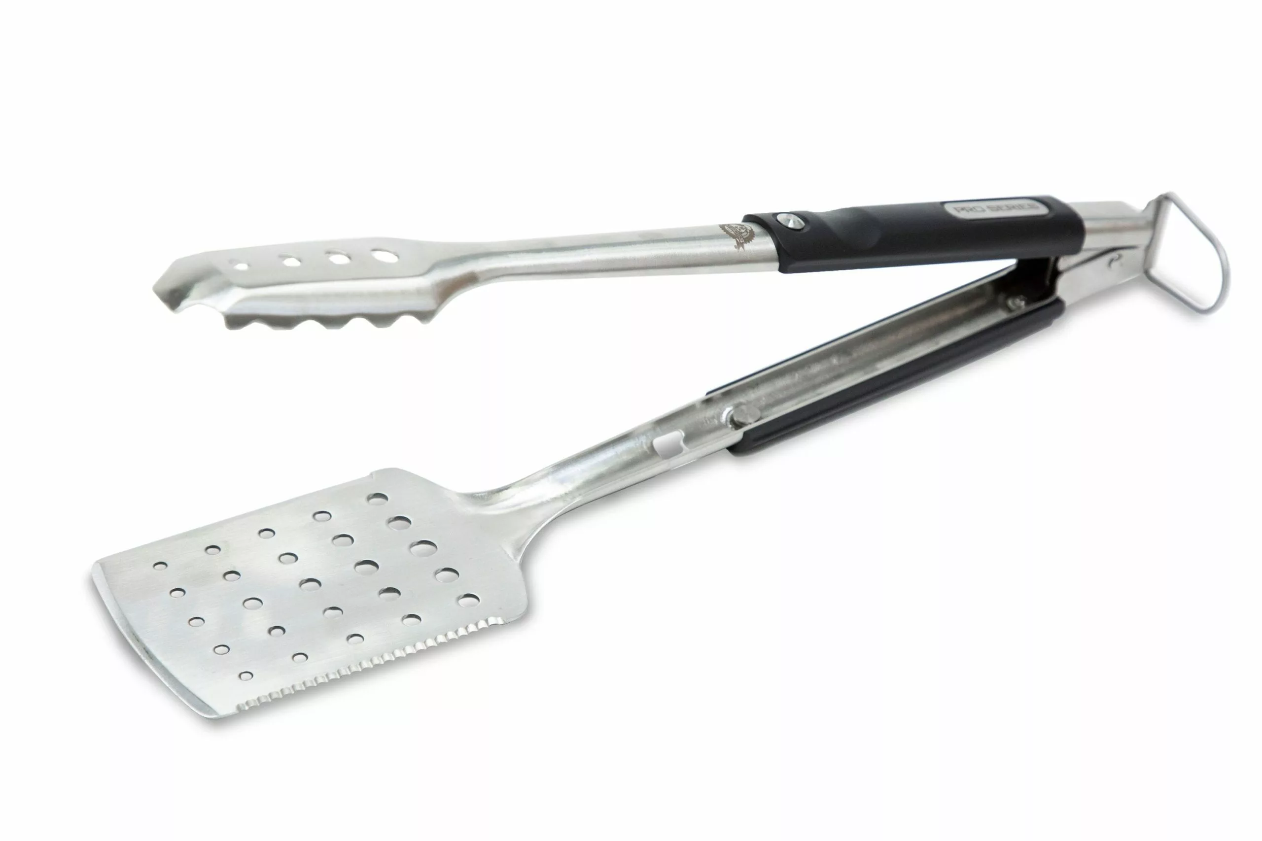 Pit Boss grills brings you the same innovation of the pro series grill with the pro series all-In-one tool. This unique design features a full spatula on one side and a raised ridge tong head on the other. You can easily open the tongs to a wide angle, and securely grip and flip a rack of ribs, thick cuts of steaks, large briskets and more. The double-thick stainless-steel construction offers durable and long-lasting use. In addition, an extra-long handle allows for grilling at a comfortable distance away from the grill heat while the nylon polymer grip provides heat resistance of up to 400ΓΒ F. the spatula has a multi-functional build that boasts a meat cleaver on one edge and a serrated tenderizer on the other and a convenient built-in bottle opener on the handle while surface holes on the spatula and tong head creates convenient drainage when handling food. Additional features include a locking tab that pulls in and out for easy storage and an enlarged hanging loop for effortless storage.