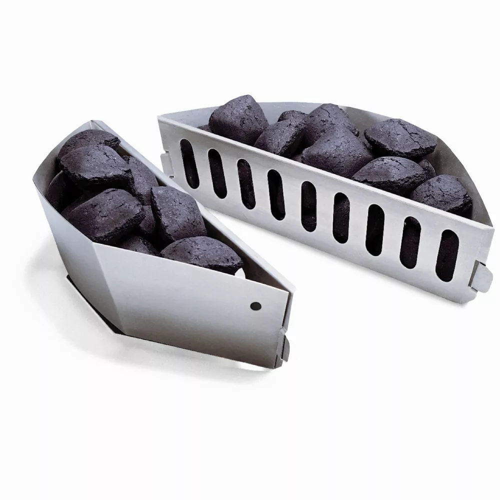 Uniformly stack briquettes for direct or indirect grilling with these charcoal fuel holders from Weber. Place them back-to-back in the center of the grill to form a direct heat source or position them to the sides of the kettle for indirect cooking. Each charcoal holder is forged with aluminized steel and outfitted with side and bottom vents to facilitate ample airflow.