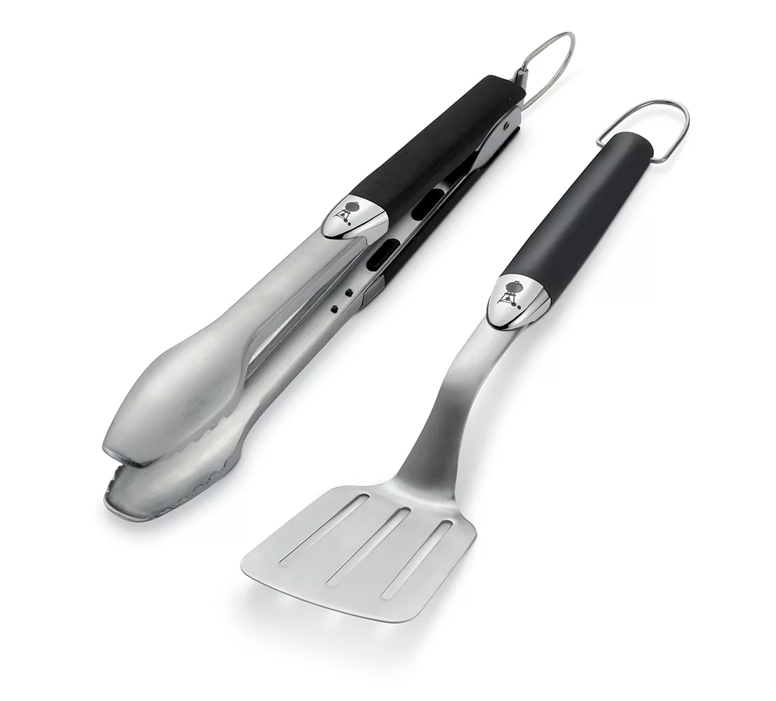 - Weber 2-piece smaller grilling tool set includes stainless steel spatula and locking tongs