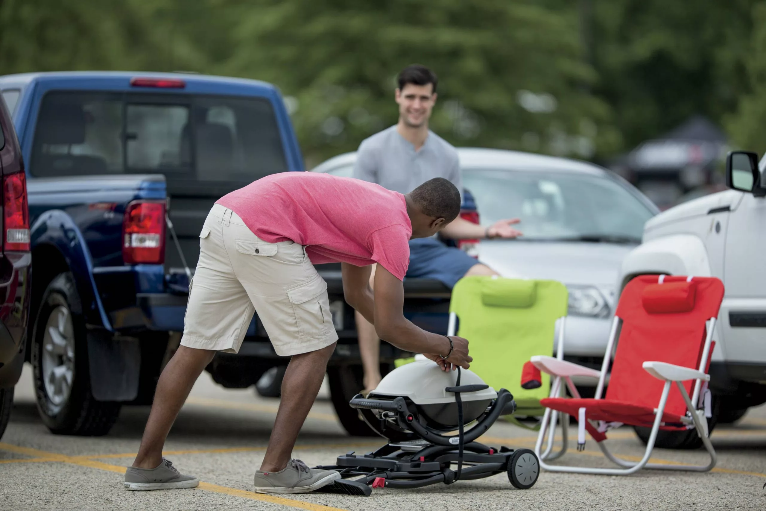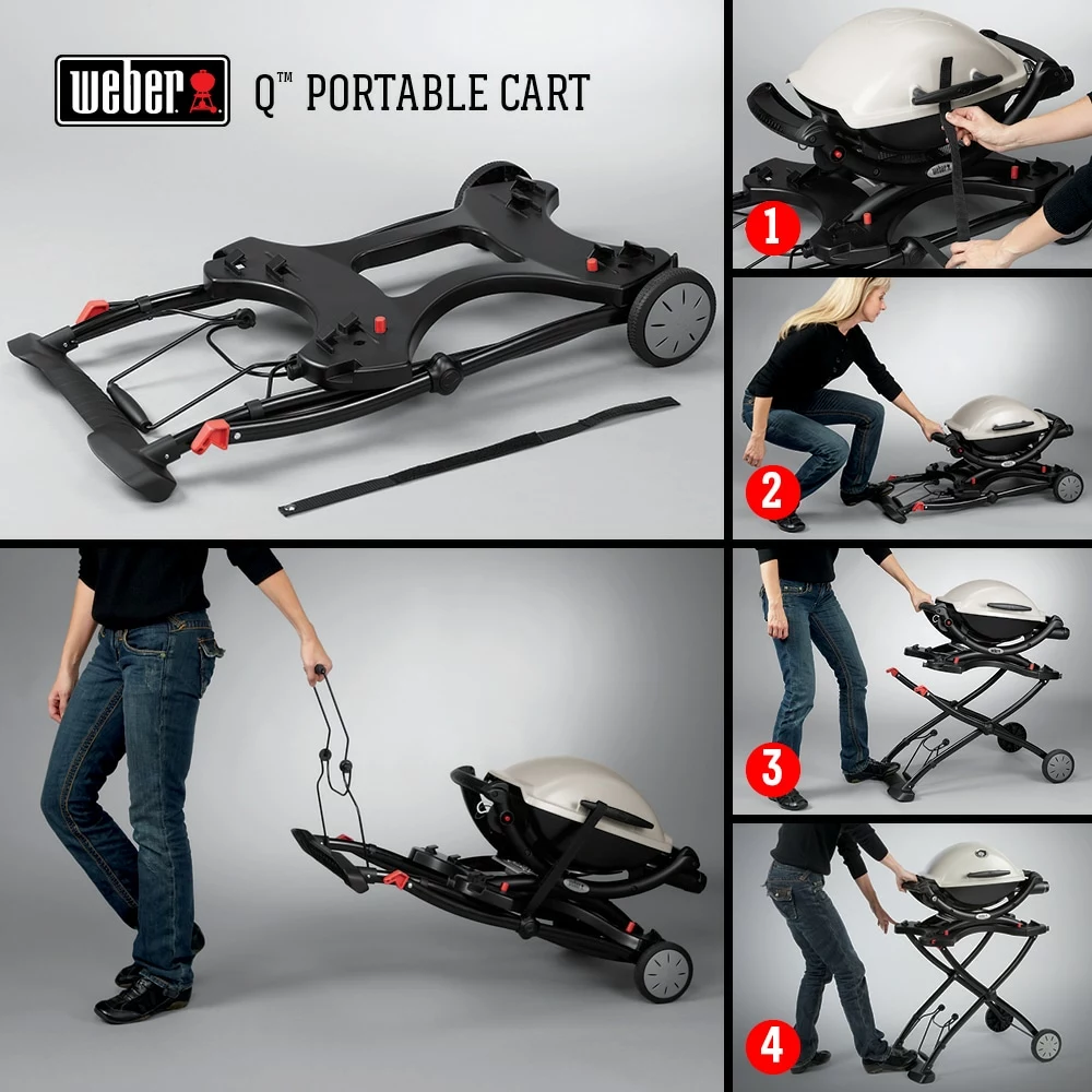 Grilling on-the-go is made even more convenient with the Weber Q portable cart. Use it to transport your 2014 Weber Q 1000/2000 series grills. It features a push button, allowing you to quickly fold and unfold the cart with your grill securely in place.